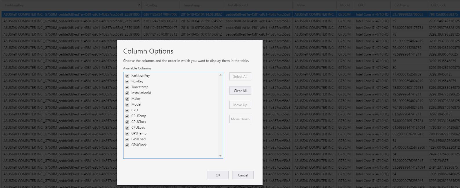 ข้อมูลอีกอย่างที่จะถูกนำขึ้น Azure Table คือ "SensorDump" โดยจะเป็นรายการของ Sensor ทั้งหมดที่อ่านได้ของเครื่องนั้นๆ ครับ ใช้ในการช่วย Debug ถ้าเกิดแจ้งเข้ามาว่า ข้อมูลบางอย่างไม่แสดงผล เป็นต้น และใช้วางแผนได้ด้วยว่า ต่อไปควรจะแสดง Sensor อะไรเพิ่มอีก ที่หลายๆ เครื่องมีเหมือนกัน - QR Code จะแสดงหน้า QR Code เพื่อให้มือถืออ่าน เพื่อเอา URL สำหรับต่อเข้ามาครับ กดแล้วจะเป็นการเปิด Web Browser และได้หน้าจอแบบนี้