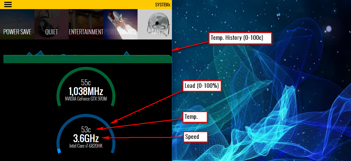 สำหรับฟังก์ชั่นหลักๆ เลยของมัน ก็คือการเอาไว้ดูอุณหภูมิ ความเร็ว และ Load (ปริมาณการใช้งาน) ของอุปกรณ์สำคัญสองชิ้นในเครื่องเราครับ คือ CPU (สีฟ้า) และ GPU (สีเขียว) วิธีดูก็คล้ายกับหน้าปัทม์รถแบบ Digital ครับ เลขตรงกลางคือความเร็ว และวงโค้งๆ บอก Load