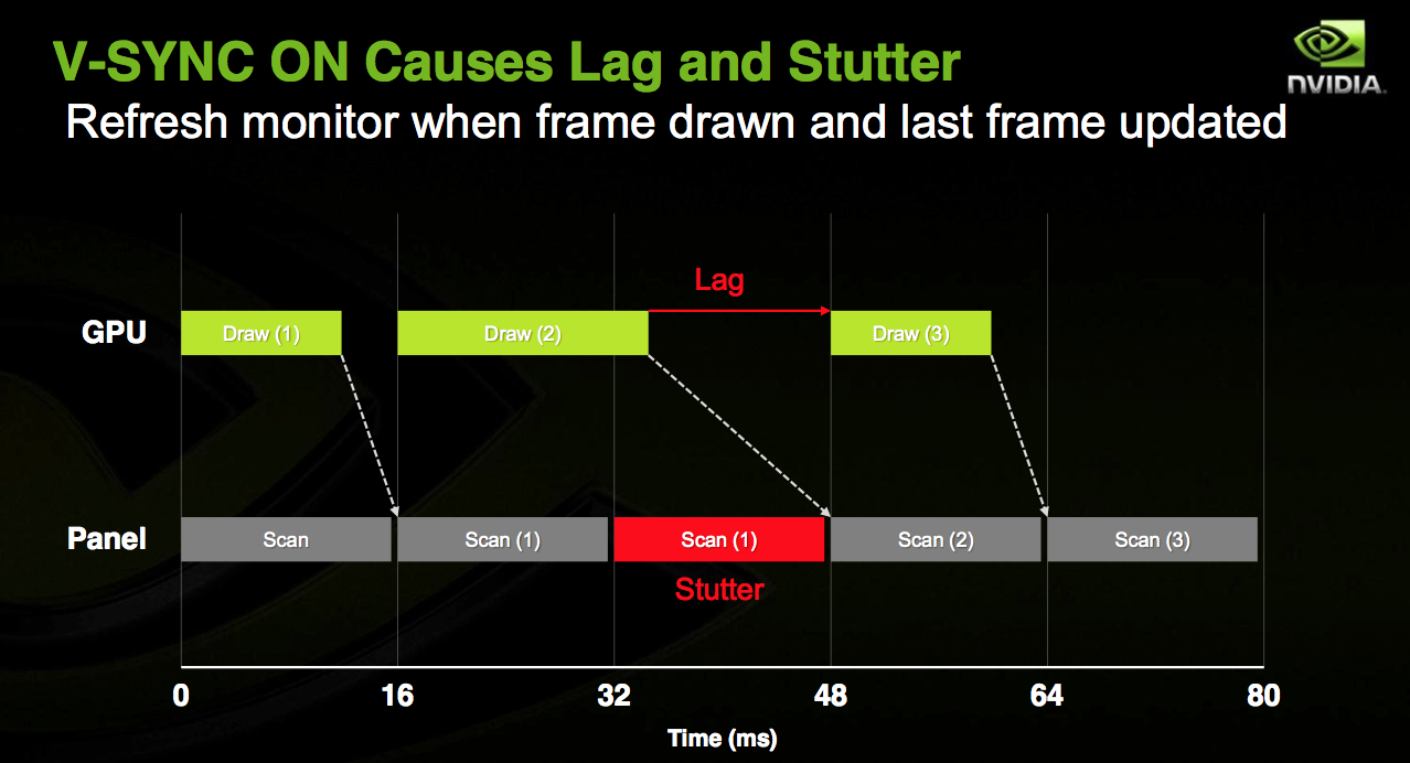V-Sync นั้น จะดีกับเรา ในกรณีที่ GPU นั้น ทำความเร็วได้สูงกว่าจอภาพ เช่น มันอาจจะใช้เวลาแค่ 12ms ในการวาดภาพ ในขณะที่หน้าจอใช้เวลา 16ms ต่อการ Scan 1 รอบ ตัว GPU ก็จะมีเวลา 4ms หยุดรอให้จอภาพ แสดงภาพก่อนหน้านี้ให้ครบก่อน (ซึ่งนับว่านานมากๆ สำหรับ GPU) จึงค่อย Swap Buffer ส่งไปแสดงผล (Scan 1) แต่มันเพิ่งรู้ตัวว่า มันควรจะเอาเวลา 4ms ตะกี้ มาวาดภาพที่สองซะยังจะดีกว่า เพราะภาพที่สอง มันใช้เวลานานกว่าภาพแรก แถมยังเกิน 16ms ด้วย ส่งไปหน้าจอไม่ทันรอบ V-Sync เพราะถ้าส่งไปเลย อาจจะเกิด Tearing มันก็เลยต้องหยุดรอให้ถึงรอบจังหวะ V-Sync อีกครั้ง จึงจะ Swap Buffer ได้
