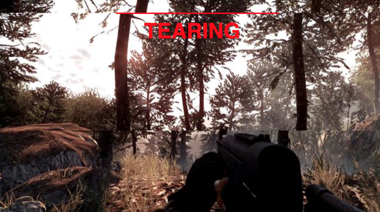 แน่นอนว่า มันไม่เท่ากับอัตราที่ GPU ทำการ Render ชัวร์ เพราะ Frame Rate นั้น ยากที่จะคงที่ (ยกเว้นแต่เราจะเขียนโปรแกรมไว้ว่า ให้ทำงานที่ความเร็วคงที่นะ) บางทีมันอาจจะเร็วถึง 100fps (หรือ 100Hz) บางครั้ง มันก็อาจจะช้ากว่า เช่น 40fps (หรือ 40Hz) การที่ Frame Rate นั้นสูงกว่า Hz ของจอภาพ จะเป็นเหตุให้เกิด Tearing เพราะว่า หน้าจอมันยัง Scan ไม่ทันจบภาพแรกที่ GPU ส่งมา ปรากฏว่า GPU ส่งภาพที่สองมาอีกแล้ว และถ้าเกิด fps กับ Hz ต่างกันมาก เผลอๆ เราอาจจะเห็น 3 ภาพบนจอเดียวกัน อย่างภาพตัวอย่างด้านบนเลยทีเดียว
